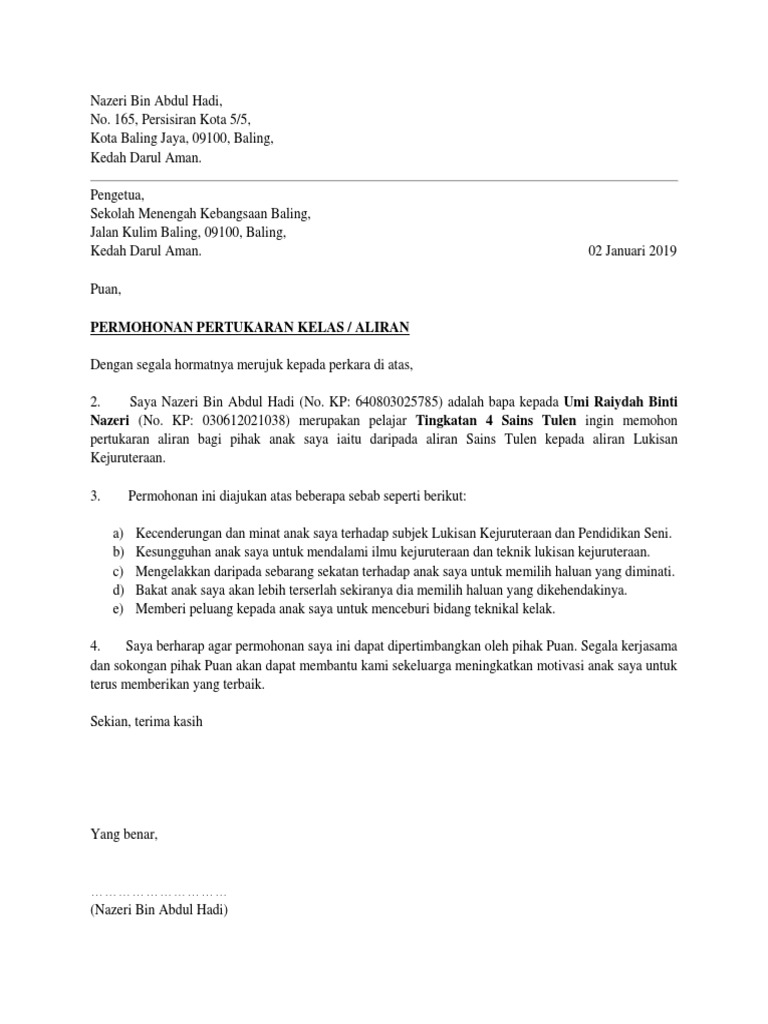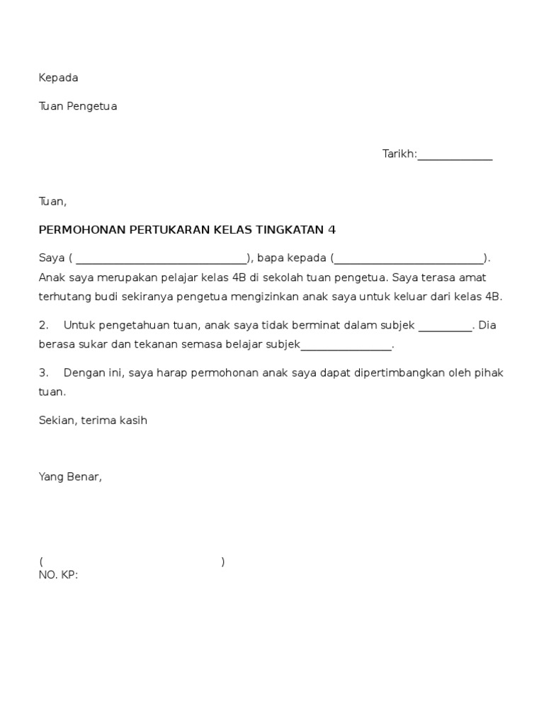 Surat Rasmi Permohonan Pertukaran Kelas Pdf